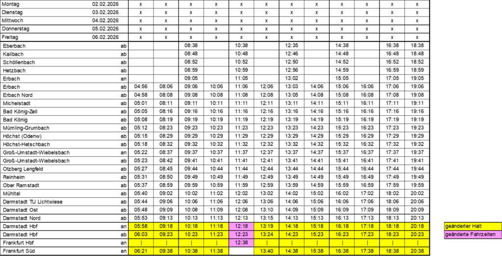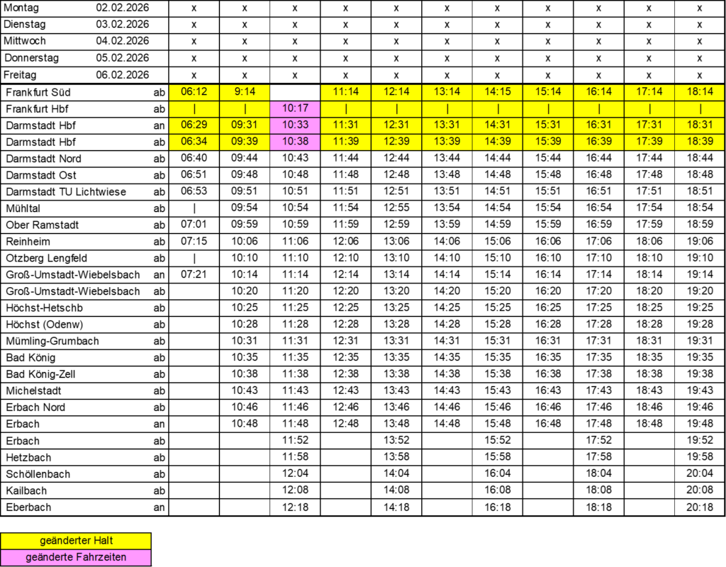 am 27. Januar sowie am 12. Februar 2026 entfallen aufgrund von Bauarbeiten folgende Züge zwischen Wiesbaden und Frankfurt, die durch Schienenersatzverkehr mit Bussen ersetzt werde